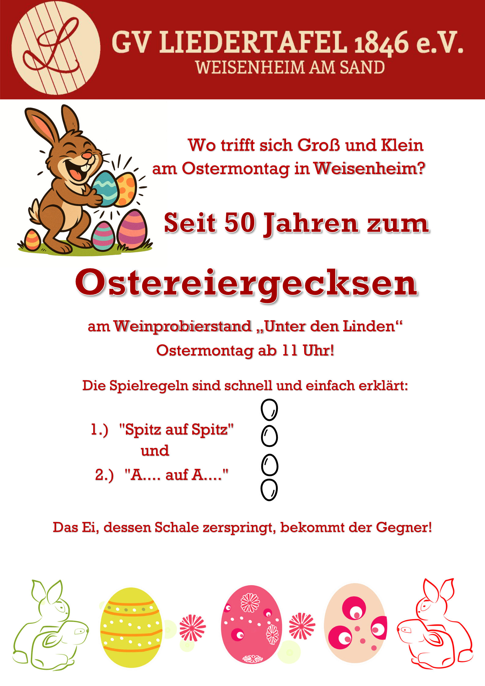 Osterhasen und viele bunte Eier werden Sie am Ostermontag zum traditionellen Ostereiergecksen am Weinprobierstand „Unter den Linden“ begrüßen.  Ab 11:00 Uhr wird bei „Spitz uff Spitz“ und „A…. uff A….“ gegeckst!