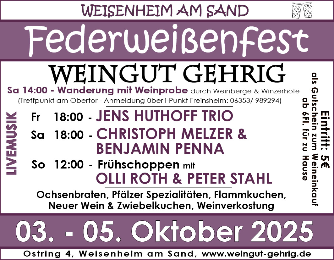 Tickets gibt's für 20 € unter www.muk-weisenheim.de und allen beteiligten Gaststätten und Weingütern.